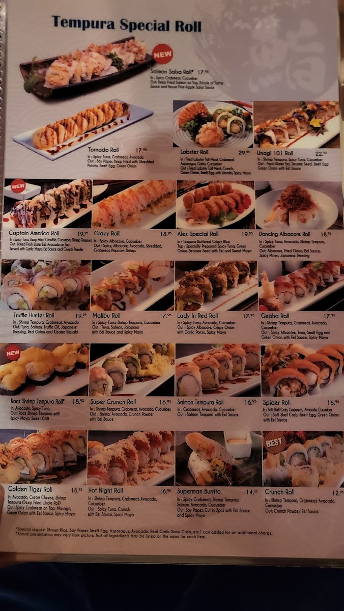 The menu is a vibrant tapestry of flavors, showcasing both traditional and innovative rolls. Among the standout selections, the Spicy Albacore Roll ($10.06) bursts with a tantalizing kick, while the classic California Roll ($9.14) delivers a comforting, familiar taste. For those seeking adventure, the Mextican Roll ($20.64) combines crabmeat, jalapeno, and cilantro for an extraordinary fusion that is not to be missed!